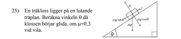 Om mg•sinθ > f = μN = μmg•cosθ så börjar klossen glida.