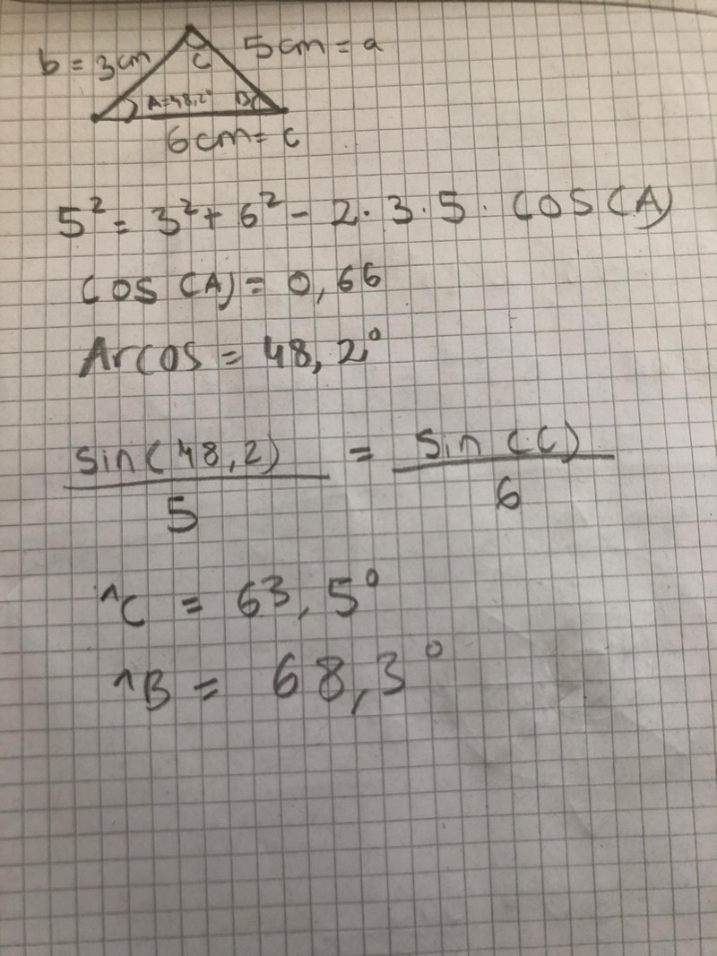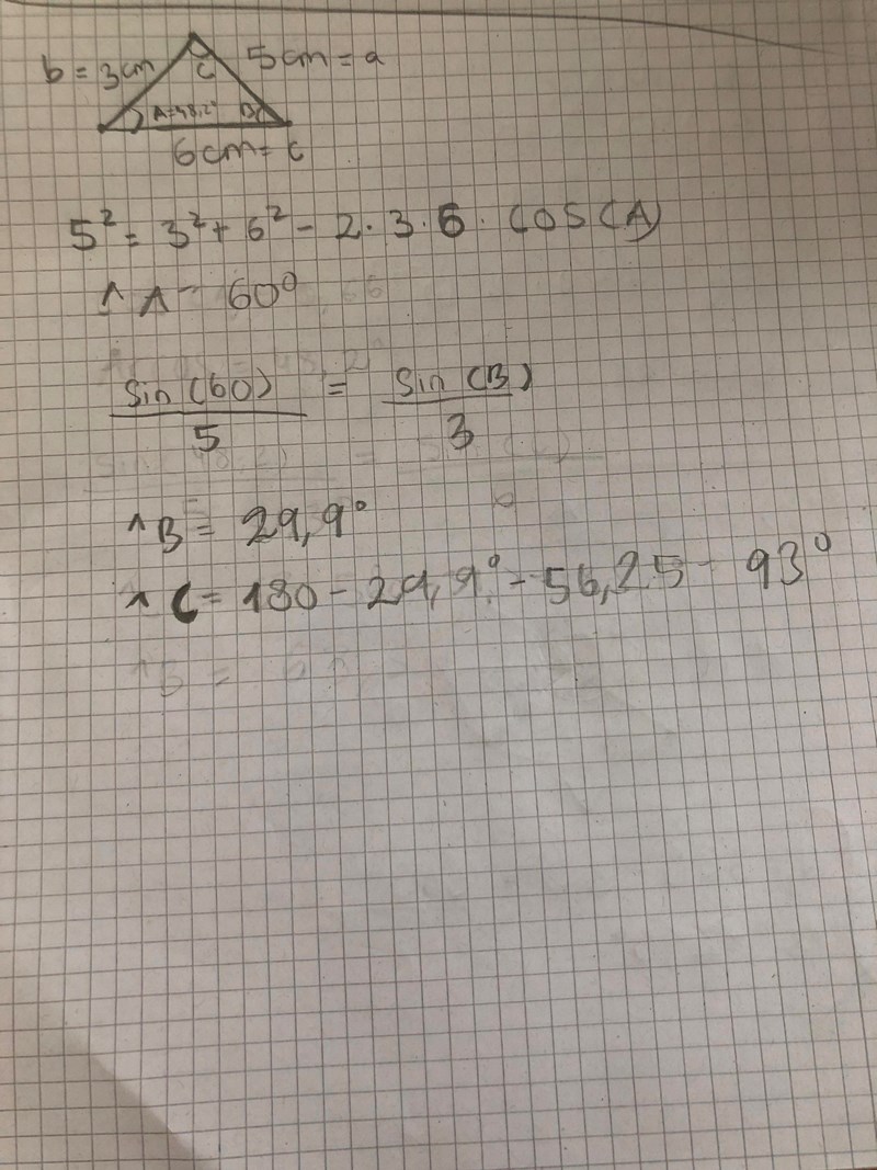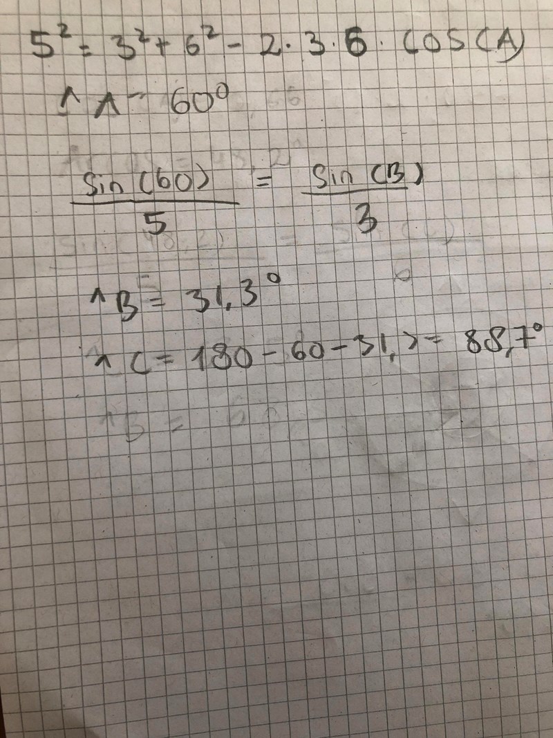 Du har en siffra fel, det ska vara   5^2 = 3^2 + 6^2 - 2*3*6*cos(A)