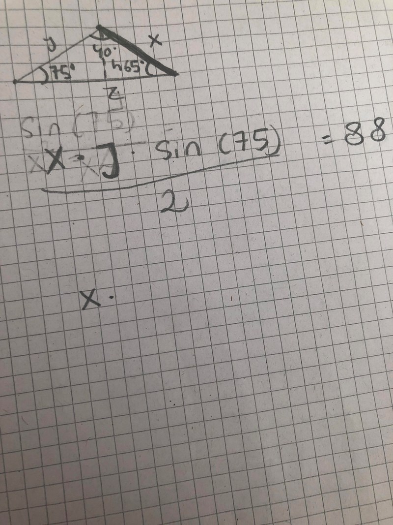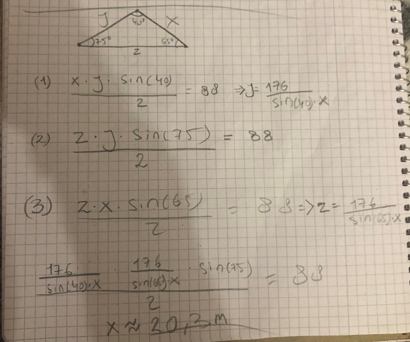 "I en triangel med aren 88 m3 är en vinkel 75 grader och en annan 65 grader. Beräkna triangelns längsta sida."