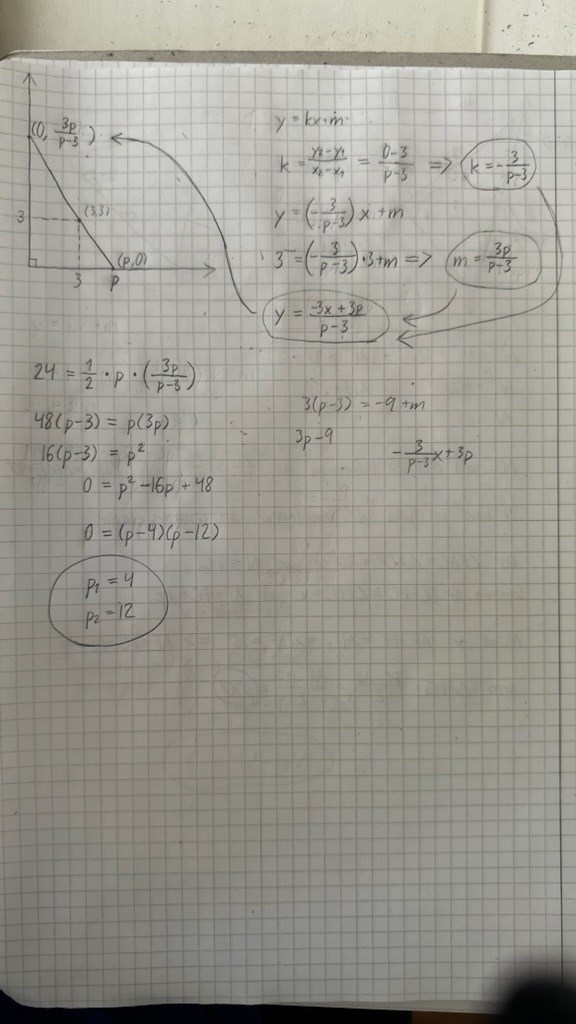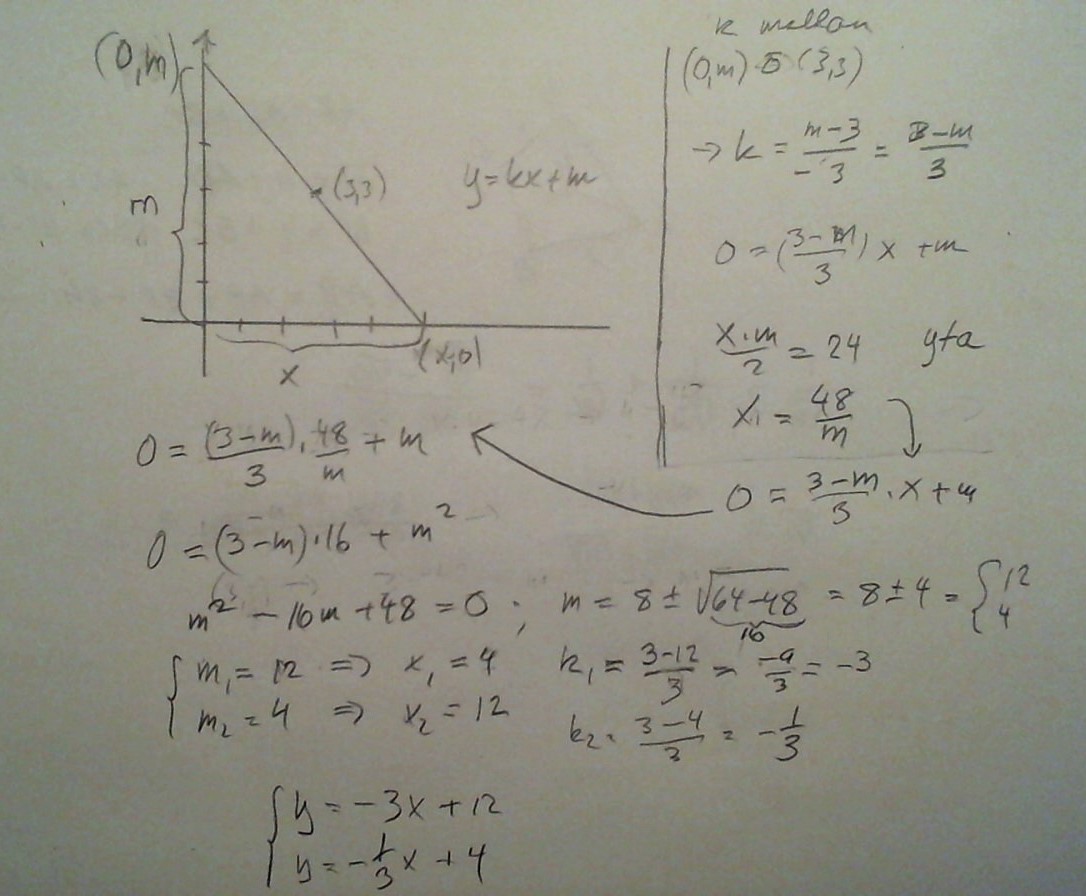 En triangel med arean 24 areaenheter begränsas av de positiva koordinataxlarna och en linje som går genom punkten (3,3). Bestäm linjens ekvation.