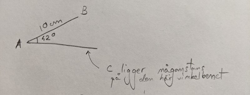 Du börjar med AB = 10cm, och du vet att vinkeln A är 42 grader. Då kan du rita AB och vinkeln A, och C kommer att ligga någonstans på den andra vinkelben som B:
