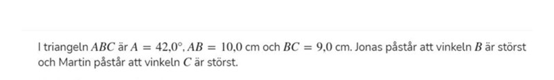 Ja, bra jobbat. Jag vill bara påpeka att sin180-x = sinx, därför kan vinkeln C också vara trubbig. Det finns alltså 2 olika lösningar, och både Martin och Jonas har rätt. Kan du hitta den andra triangeln ABC?