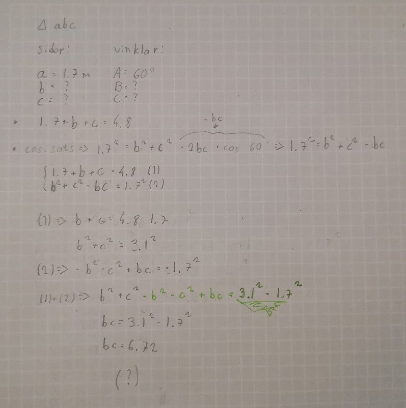 Suttit hur länge som helst med denna men får alltid fel när jag sätter upp det i ekvationssystem. b*c kan omöjligt vara 6.72, b+c är 3.1. Var gör jag fel någonstans? Otroligt tacksam för svar