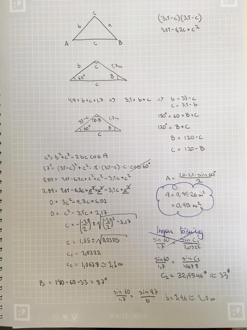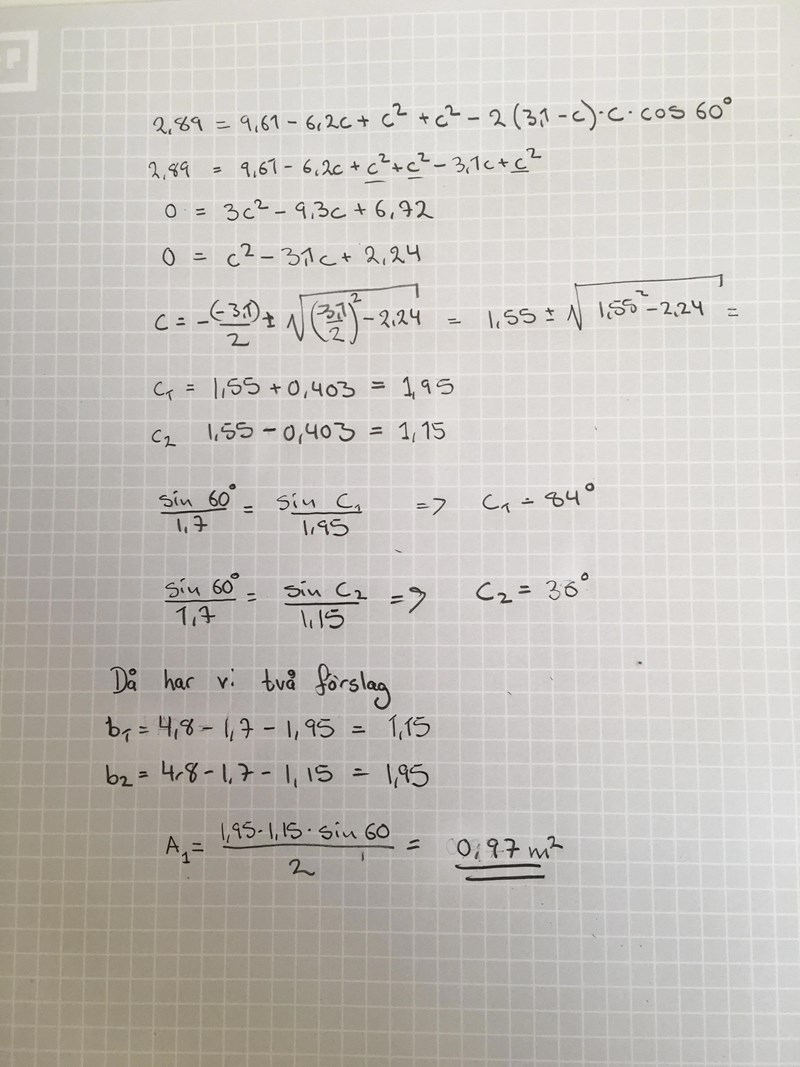 En triangel har omkretsen 4,8m. En vinkel är 60 och motstående sida är 1,7m. Beräkna triangels area.
