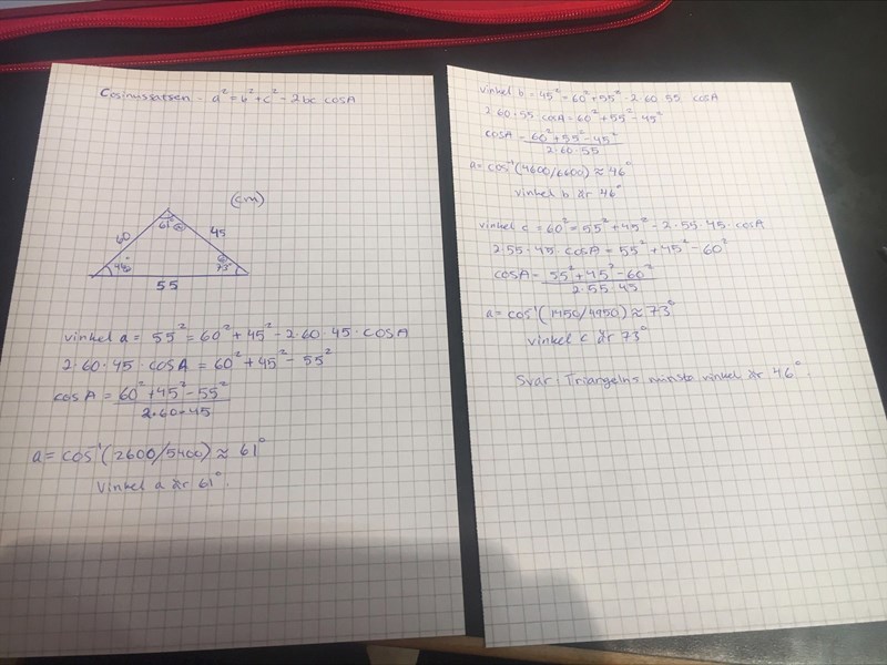 61+73+46=180 så det verkar vettigt. Det är, bortsett från det jag klagar på förut, korrekt. Kladd eller inte, skriv korrekt, det är så lätt att tappa bort sig annars, Jag hade behållit cos a tills jag kommit fram till cos a = (4600/6000) och då bara konstaterat att a = 46 grader.
