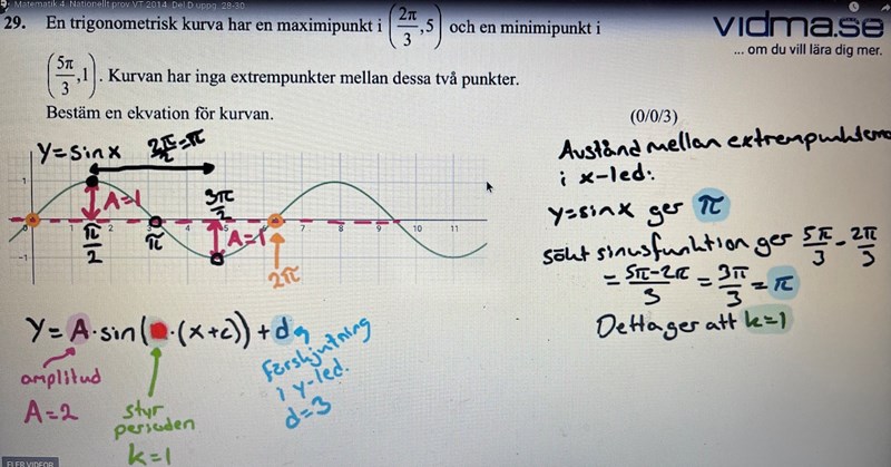 Hej! Jag förstår inte varför k värdet ska vara 1 i sinusfunktionen. Om perioden är 180 grader i grafen borde inte k vara 2? Varför ska det vara 1 .. Jag undrar varför sinus funktionen som man ska bestämma ska vara förskjuten åt vänster?