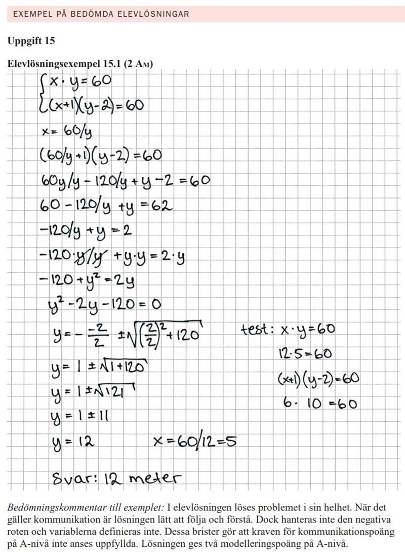 Har du tittat på de bedömda elevlösningarna på slutet av provet i provbanken? Ja, det har jag. Gjorde jag ett misstag som glömde att ställa upp ett ekvationssystem...? De har inte sagt om några omvägar, fast eftersom jag ändå fick rätt borde det väl inte göra något? Det var de exemplen jag syftade på.