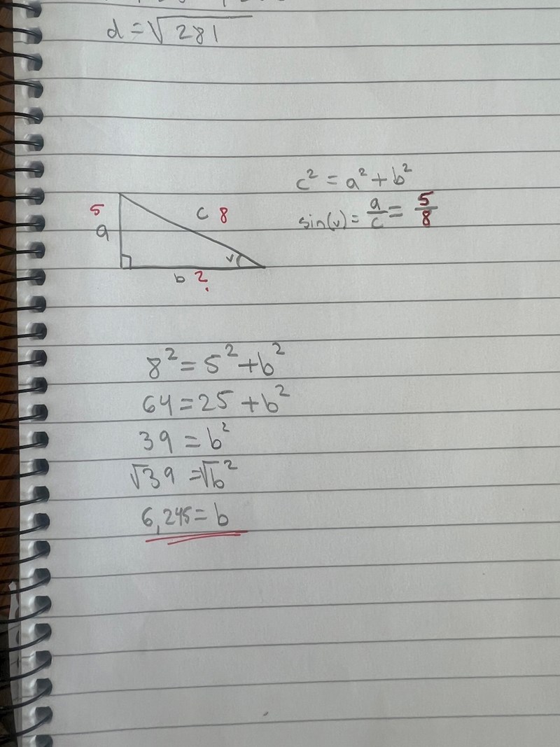 Egentligen är din uppställning inte helt rätt eftersom det inte finns något som säger att hypotenusan faktiskt har längden 8 och att den motstående kateten faktiskt har längden 5. Det enda som sägs är att förhållandet mellan längden av motstående katet och längden av hypotenusanr 5/8.