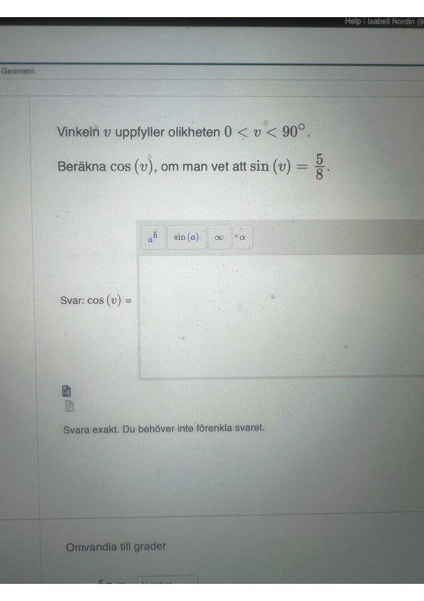 Bra, säg till när du har gjort det så kan vi visa kopplingen till "trigonometriska ettan", med vars hjälp uppgifter av denna typen går att lösa enklare och snabbare.