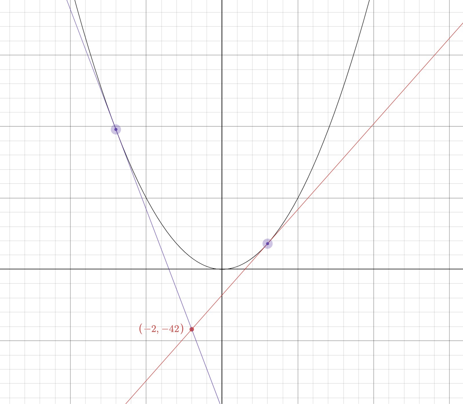 Funktionen f(x) = 2x2 tangeras av två linjer i två punkter (se figur). De två tangerande linjerna skär varandra i punkten (-2;-42). Bestäm en av linjernas ekvation.