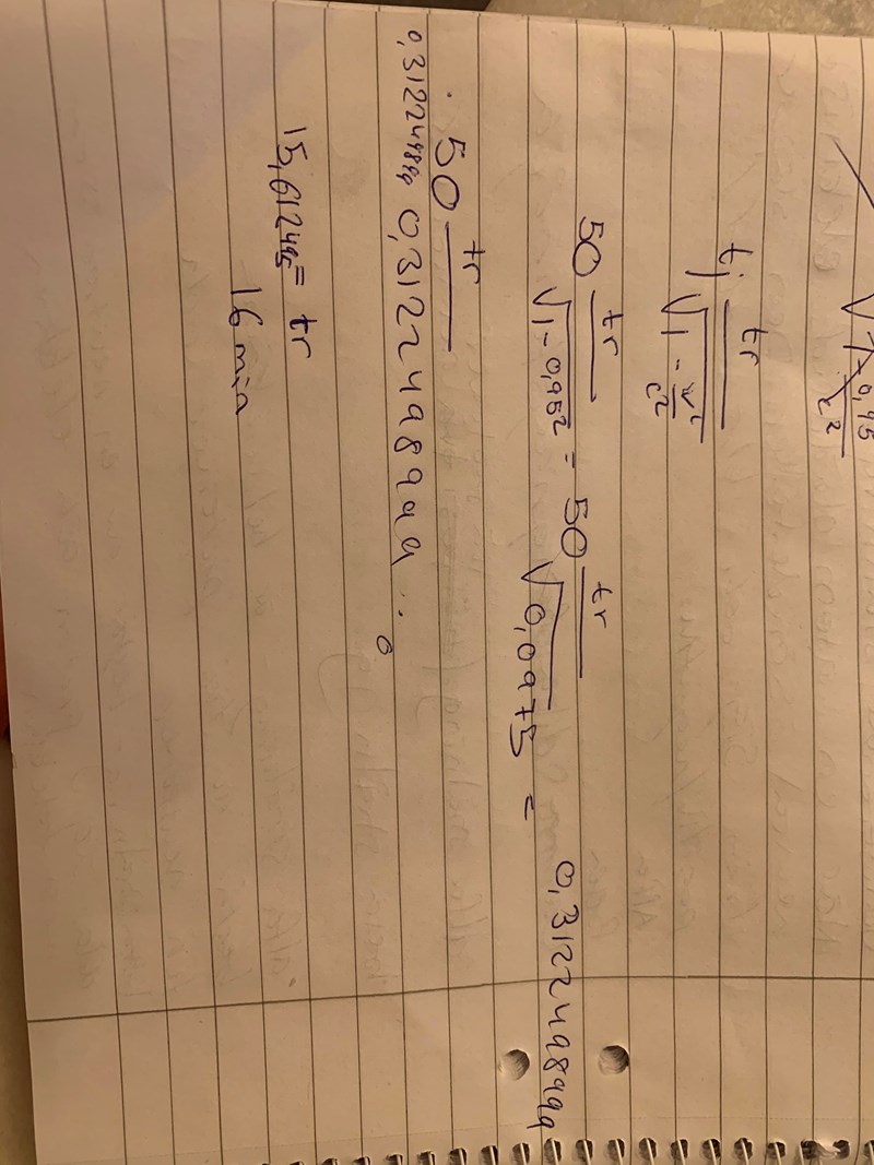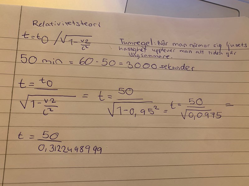 En utomgalaktisk rymdflotta passerar förbi jorden med v= 0,95c, då de noterar att du sitter med ett fysikuppdrag i modern fysik. Det tar dig 50 minuter för att göra klart uppdraget. De bestämmer sig för att mäta skrivtiden och längden på ditt provpapper med en ”StrompfZygniebwo-meter”