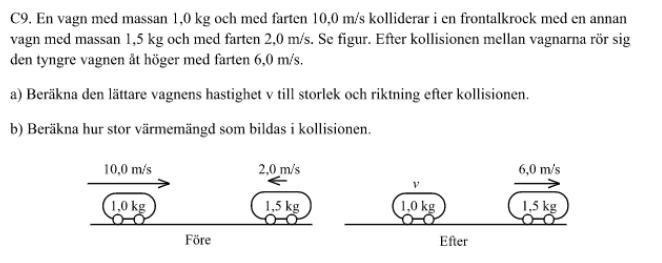 pi-streck=en-halv skrev :Vagnen med massa kg har före kollisionen en hastighet , och efter kollisionen . Om man definierar höger som positiv riktning.