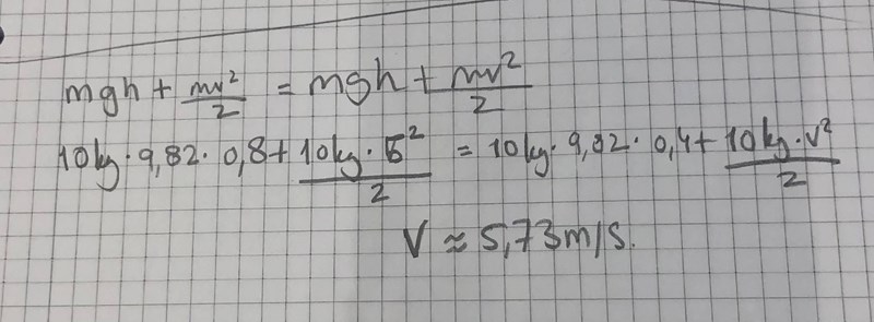 En vagn med massan 10 kg kan röra sig längs en bana. Vagnen startar med hastigheten 5 m/s i punkten A som ligger på höjden 0,8 m. Vilken hastighet får vagnen i punkten B, som ligger på 0,4 meters höjd?