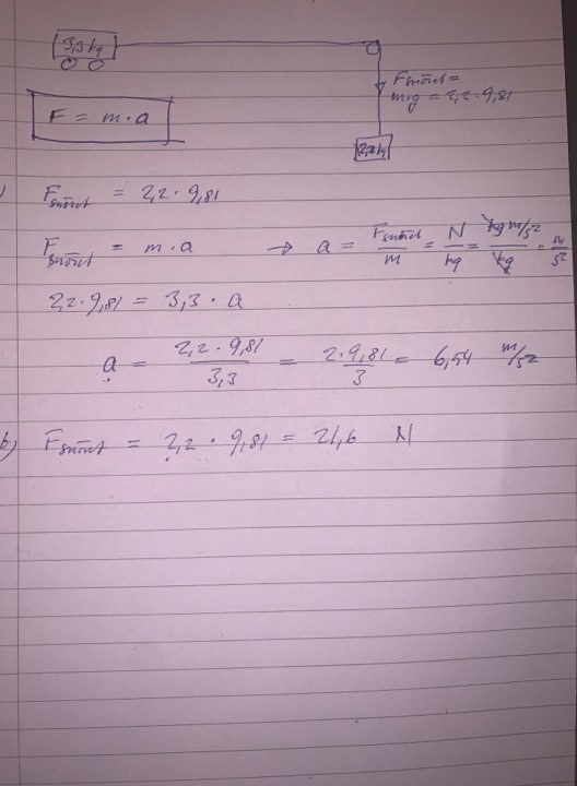 Således i kraftekvationen: 5,5*a = 2,2*g => a = 2,2*g/5,5 ungefär 3,9 m/s2
