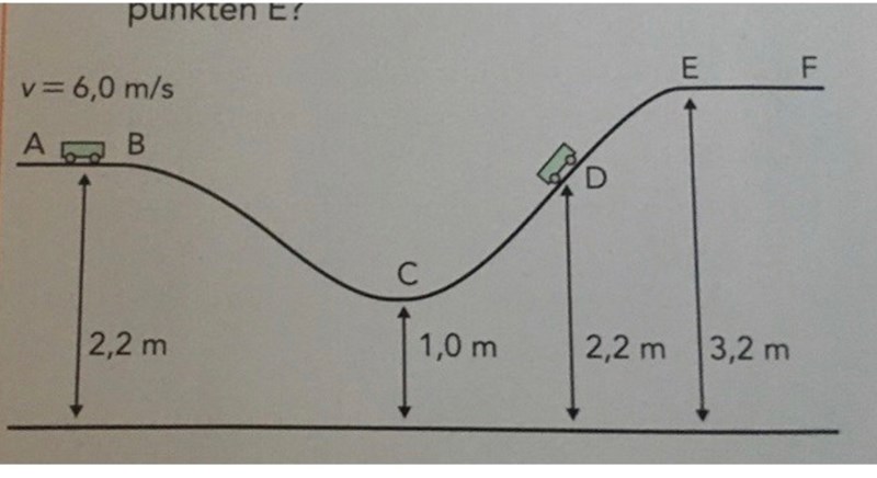 D) Vad är den minsta hastigheten vagnen kan ha vid B för att den ska kunna komma upp till punkten E?