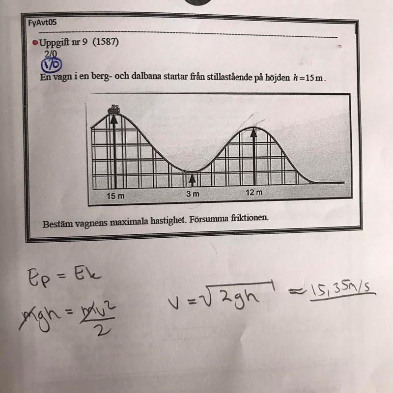 Hastigheten efter första backen är mycket riktigt eftersom vagnen där har förlorat 15 - 3 = 12 meter i höjd.