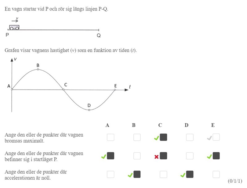 Hej jag undrade bara varför C inte stämmer på rad 2 (Ange den eller de punkter där vagnen befinner sig i startläget P.). I grafen så ser man ju att vagnens hastighet ökar till punkt B och sedan har den exakt samma acceleration åt andra hållet. Då borde den väl komma tillbaks till samma punkt?