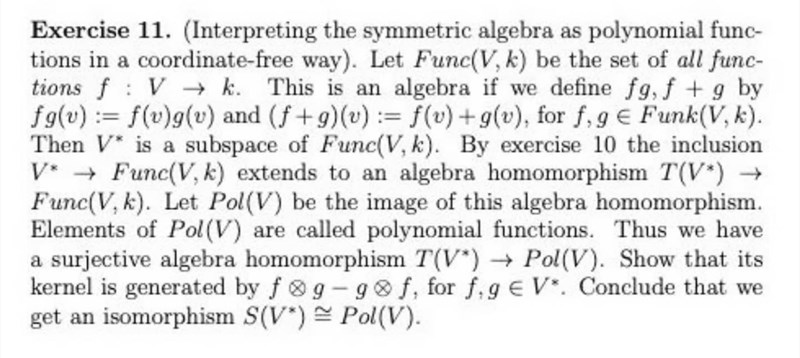 För att svara på frågan så behöver man en hyfsad dos formell algebra. Mer precist så behöver man känna till definitionen av en algebra, definitionen av en tensorprodukt och definitionen av en tensoralgebra vilket man kanske gör i masterkurs i abstrakt algebra (när jag läste så skulle det ha varit Algebra D, men kursnamn skiljer sig ju åt en del).