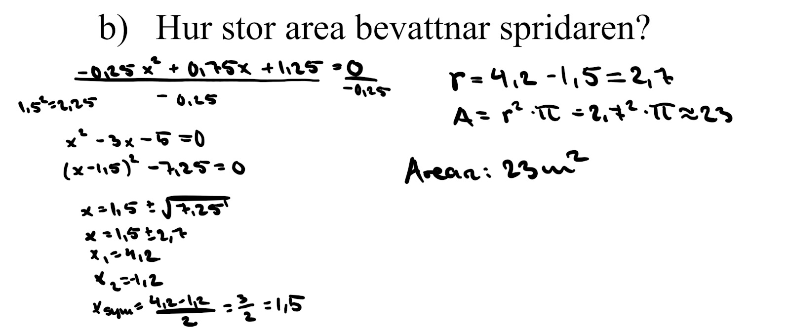 En vattenspridare är placerad på en stolpe på en gräsmatta. Spridaren roterar och bevattnar ett cirkulärt område ända in till stolpen. Den vattenstråle som når längst ut från spridaren kan beskrivas av funktionen y= -1.25x^2 + 0.75x +1.25 där x>= 0.