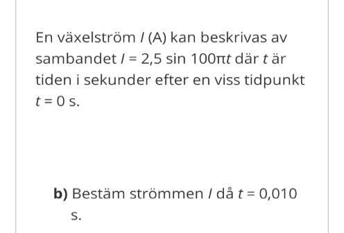 Uttrycket för I(t i sekunder)=...Ampere (A) man tar det ursprungliga uttrycket och sätter in t= 0,010 (s). Vid den tidpunkten är I=2,5sin(100pi0,010) Ampere. I=2,5sin(pi)=2,5*0 därför sin(pi)=0.