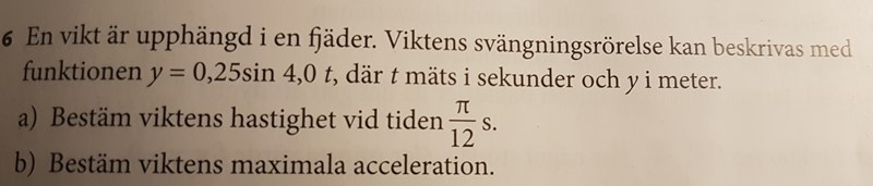 i b uppgiften efterfrågas maximala accelerationen. Att söka max för en sinfunktion är lätt eftersom sinus är periodisk och varierar mellan +1 och -1, så max är alltså....