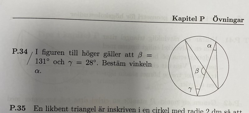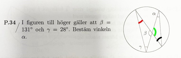Hej! Har panik. HUR ska man ens börja, det är ju inte en randvinkel eftersom linjerna inte går genom mittpunkten. Facit säger alfa=34 grader.