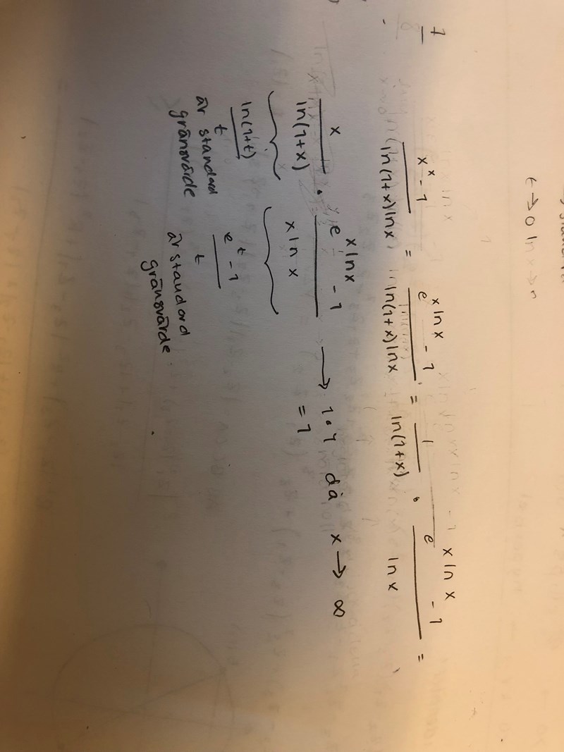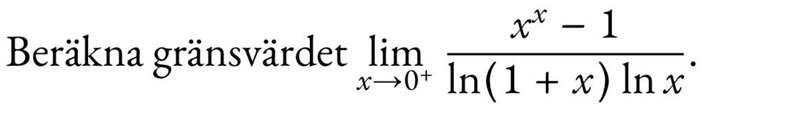 Samma bara att jag skrivit e^xlnx där det innan var x^x! Försökt att utveckla mer men kommer ej fram till något! tänkte leta efter standardgränsvärdet (e^t-1)/t och ha t=xlnx men funkar ej :(