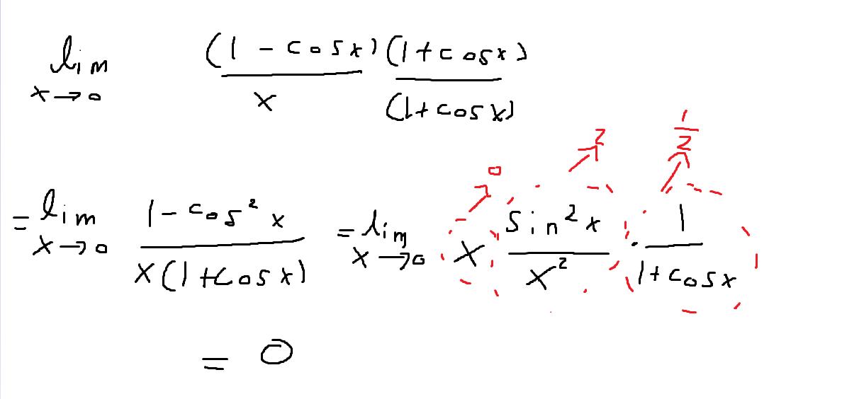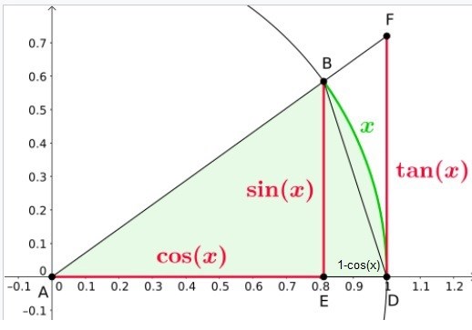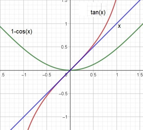 Vi ser att det stämmer med denna figur där f(x) = (1-cos(x)), g(x) = (1-cos(x))/x