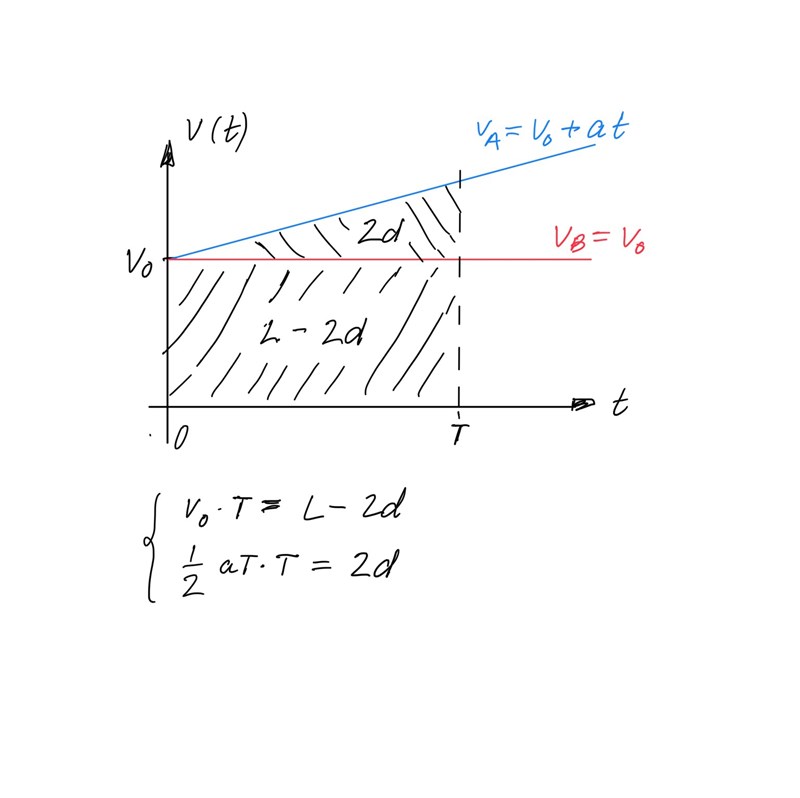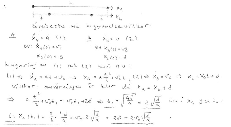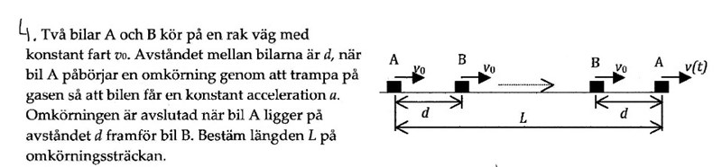 Ja. Hur lång tid tar det för bil A att komma från ett avstånd d bakom bil B till ett avstånd d framför bil B när accelerationen är a? (från "stillastående" alltså)