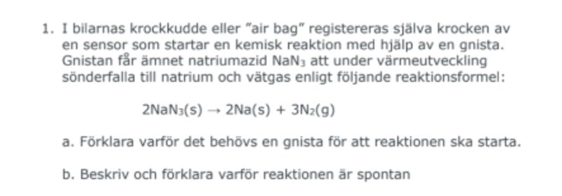 a) Eftersom reaktionen är endoterm. Gnistan är aktiveringsenergin som krävs för att bryta bindningarna mellan natrium- och kväveatomerna. Aktiveringsenergin som krävs för att bryta bindningarna är större än den energin som avges när de nya bindningarna bildas. Därför är reaktionen endoterm och behöver en gnista för att starta reaktionen.