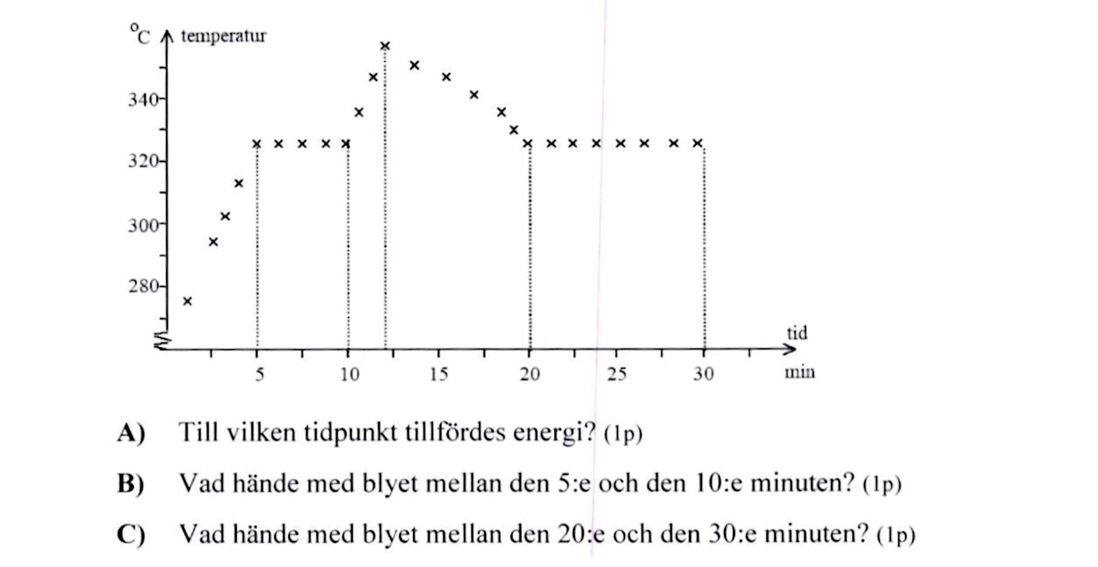 Hej ag skulle behöva hjälp med b och c. På fråga b så tror jag att blyet smälter mellan den 5 och 10 minuten. Är det samma vid den 20 och 30 minuten?
