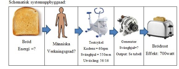 2015 genomfördes ett arbete på Stockholms konstnärliga högskola ett projekt för att uppmärksamma energikonsumtion/åtgång genom att låta ett antal atleter driva en brödrost med en träningscykel. Med andra ord direkt omvandla den kemiskt lagrade energin via rörelseenergi vidare till elektrisk energi för att avslutningsvis använda värmeenergi i brödrosten för att rosta en skiva bröd.