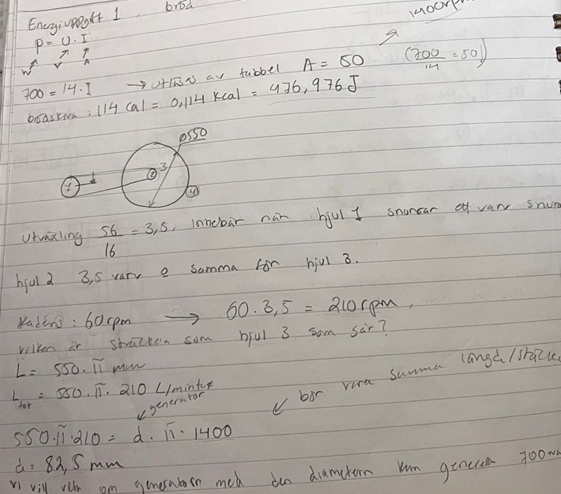 så här jag tänkt, jag har löst hur stor diametern på generatorn är men jag vet inte hur jag ska räkna ut hur mycket energi generatorn kan generera och om det räcker.