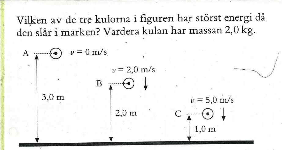 h2 är ju noll, så den totala energin vid marken är rörelseenergin. Beräkna denna i samtliga fall.