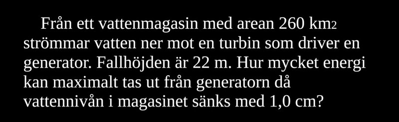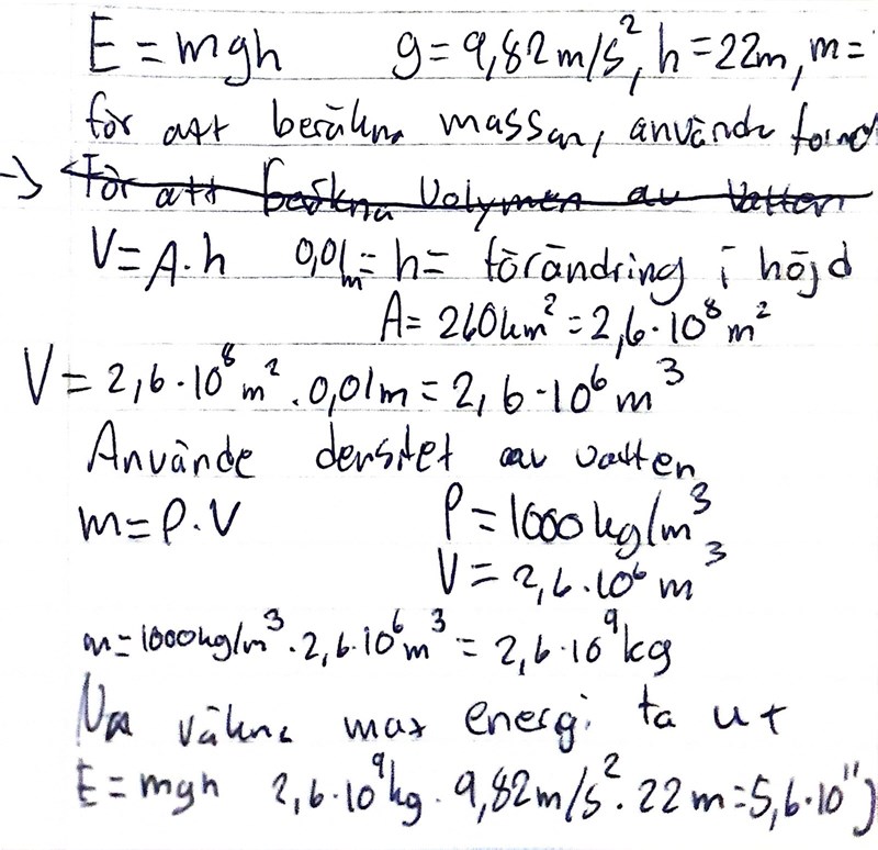 Tips: Den energi som maximalt kan tas ut är lika med den lägesenergi som vattenmagasinet förlorar i och med att en viss mängd vatten förflyttar sig 22 meter neråt.