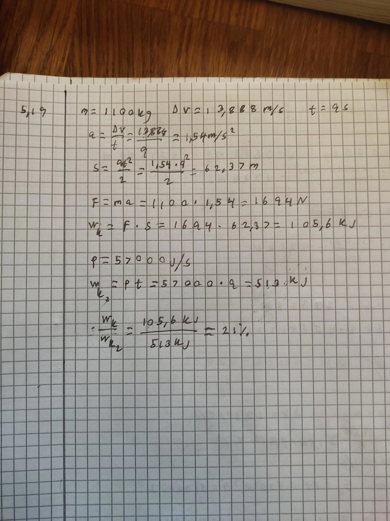 En bil med massan 1100 kg accelererar från 0 m/s till 13.88888 m/s på 9s. I detta tidsintervall utvecklar motorn en genomsnitllig effekt på 57 kW. Hur många procent av den energi som motorn avger under de 9 sekunderna åtgår för till öka bilens kinetiska energi