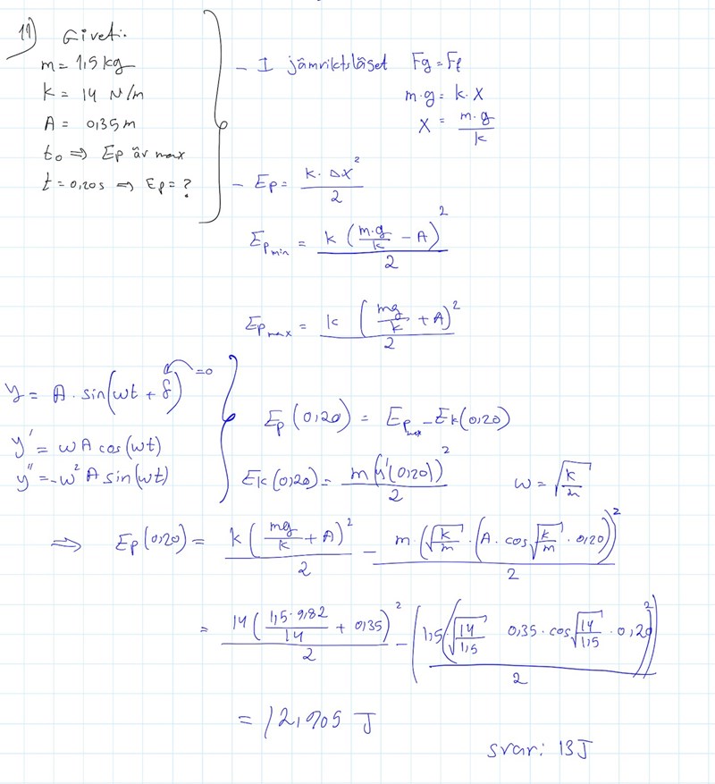 En vikt med massan 1,5 kg sitter fast i en lätt fjäder och svänger vertikalt med försumbar friktion. Fjäderkonstanten är 14 N/m. Svängningen har amplituden 0,35 m. Låt t0 vara en godtycklig tidpunkt då energin som är lagrad i fjädern är maximal. Bestäm energin som är lagrad i fjädern 0,20 s efter tiden t0.