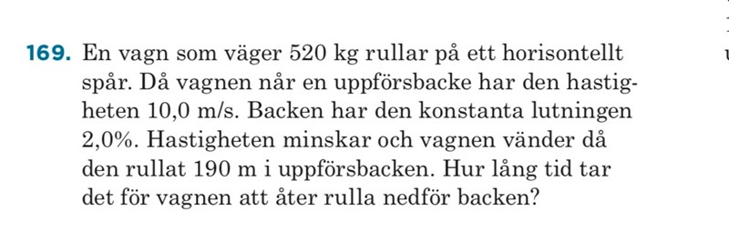 Lägesenergin ovanför backen blir till rörelseenergi + friktion. Friktionen på nervägen borde vara samma som på vägen upp. Kommer du vidare?