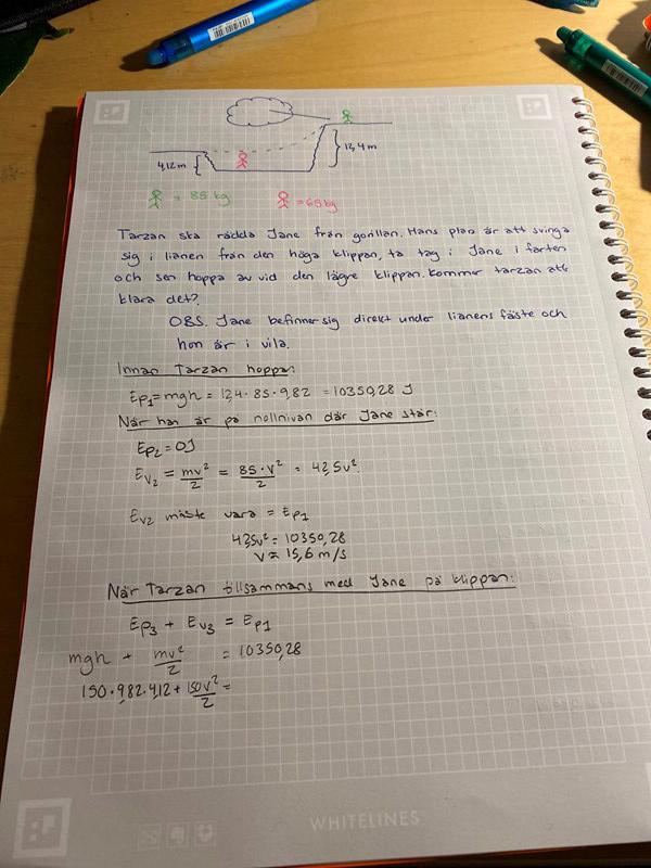 Han svingar sig ner, griper Jane och vi antar att båda hoppar av på den lägre höjden. Tarzans ursprungsenergi har då använts för att lyfta båda och frågan är om den är tillräckligt stor. Hur stor är energin i slutläget? Är den större, mindre eller lika med ursprungsenergin och vad innebär det?