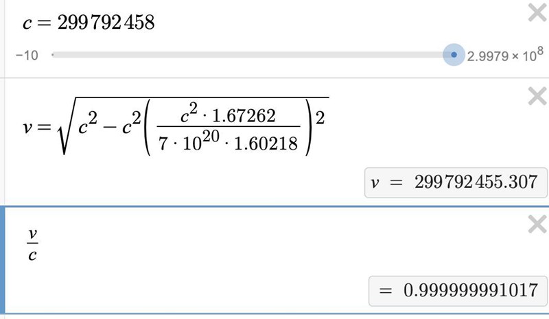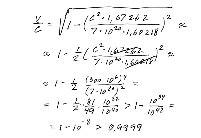 Därmed är 11-v2/c2=49·1065·107.\frac{1}{1-v^2/c^2} = 49 \cdot 10^6 \approx 5\cdot10^7.