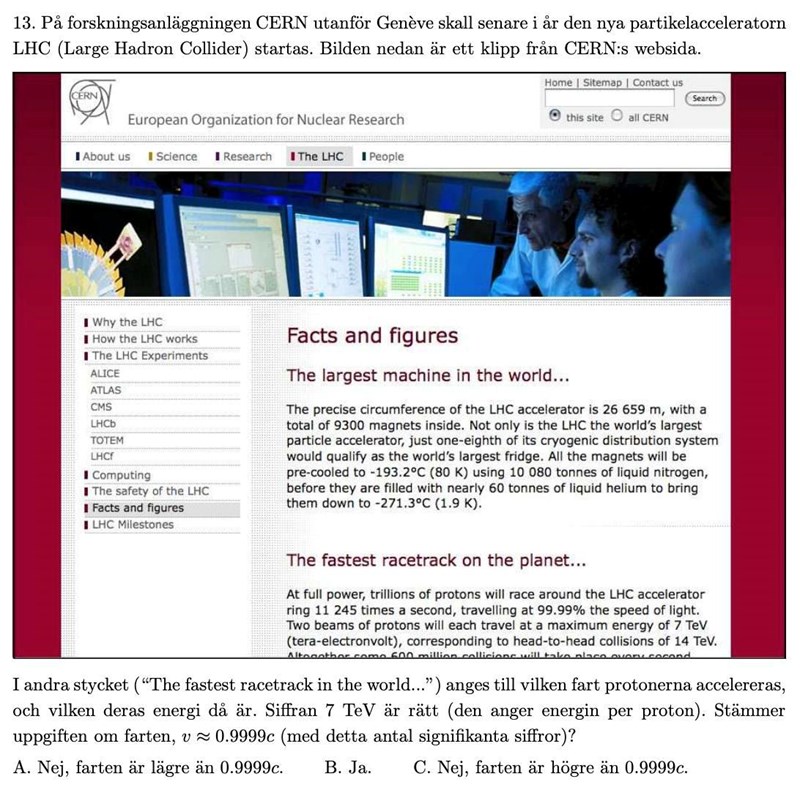 Protonernas kinetiska energin är 7 TeV. Eftersom mpc21m_p c^2 \approx 1 GeV ser vi att Lorentzfaktor γ7000\gamma \approx 7000.
