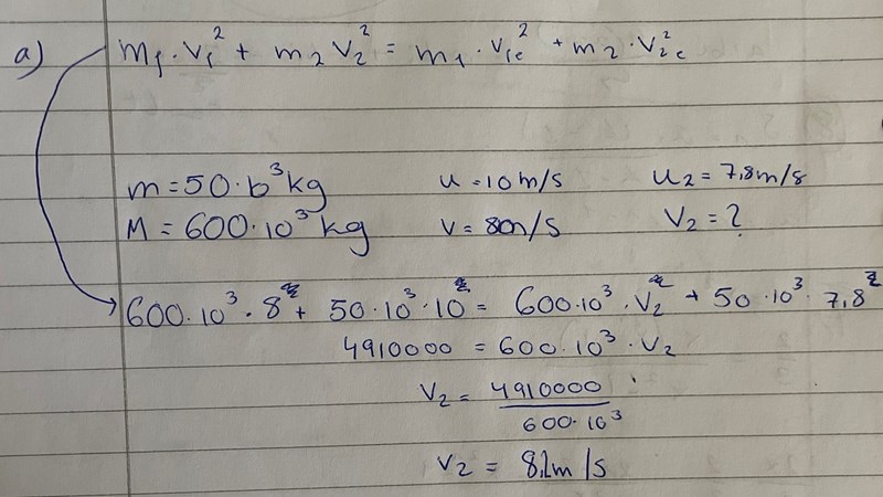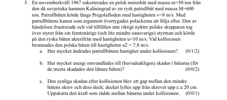 detta är inget svar, jag fick samma svar som dig på a) uppgfiten 8.18333...m/s. Men hur kommer det sig att efter en kollison att den patrullbåten har en högre hastighet? Borde inte den minskas litegrann istället?