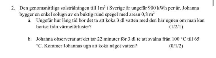 PS. Den här uppgiften tycker jag inte är så väl formulerad. I stället för att utgå från den genomsnittliga solstrålningen så tycker jag att det är rimligare att räkna på maximal solstrålning. Är uppgiften hämtad från en lärobok. I så fall skulle det vara intressant att veta vilken.