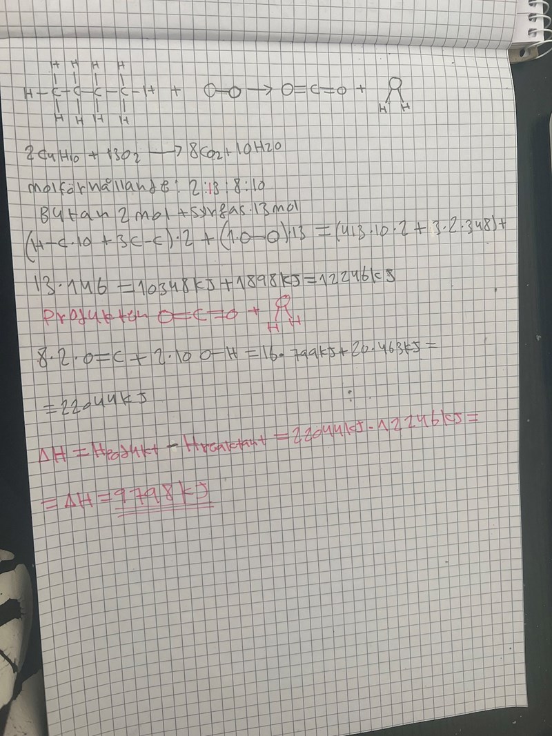 jag påstår att reaktanten kostar 10*kolväte väte bindning och 3kol bindnigar och 13 syre syre bindning. produkten beräknade jag på samma sätt