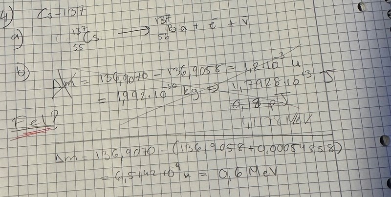 Oavsett facit eller vad jag säger kan du kika här (sök på ’mass defect’ respektive ’decay energy’): https://www.chemlin.org/isotope/cesium-137