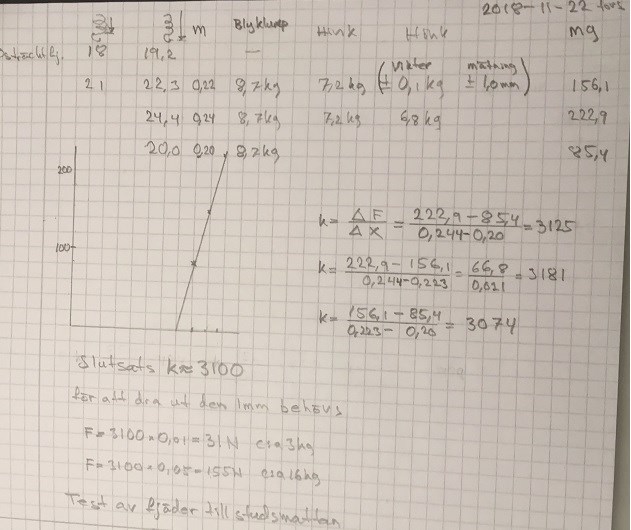 För att ha någon uppfattning om värdet på k så kollade jag en fjäder med tre olika vikter och fick fram att  k3100