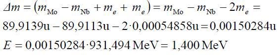 m=(mMo-42me)-(mNb-41me)-me=mMo-mNb-2me=(95,94-92,91)·1,66054·10-27-2·9,1094·10-31kg=5,0...·10-27kgE=mc2=(5,0...·10-27·2997924582)/(1,6022·10-19) eV2,8·109 eVMen svaret är 1,4 MeV. Facits lösning: