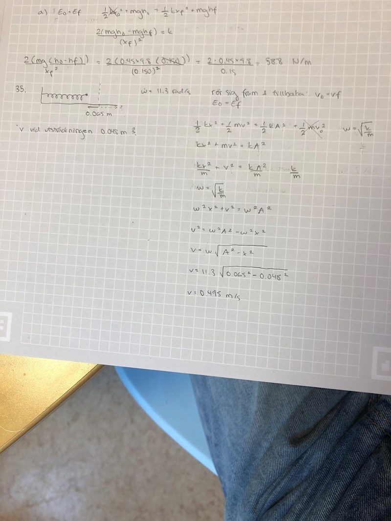 Hej! Jag håller på med en uppgift som jag har fått rätt svar på men det jag inte förstår är hur man kan sätta upp en ekvation där E0=Ef. Fjädern rör sig inte hela vägen ut till nästa ”svängning”, alltså amplituden/ där fjädern vänder tillbaka. Jag har lite svårt att greppa hur energibevarandet då kan vara lika stort. Hade något kunnat förklara detta för mig? Tack på förhand!