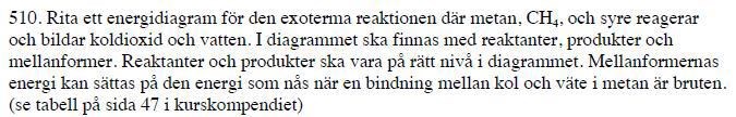 Hur mycket energi behöver man tillföra för att bryta en av bindningarna mellan kol och väte i metan? Enligt uppgiften skall du rita in mellanformen så högt ovanför reaktanternas energinivå.