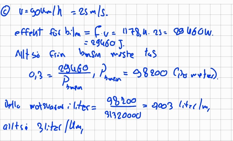 Jag tänkte att effekten som motorn behöver vid 90 km/h är 1178.8(friktionskraften) * 90 km/h, alltså 106056. Då är energin som måste in i motor från bensin är 106056/3 = 353520. Och sedan delar jag 353520/ 8700, för att få antalet liter.